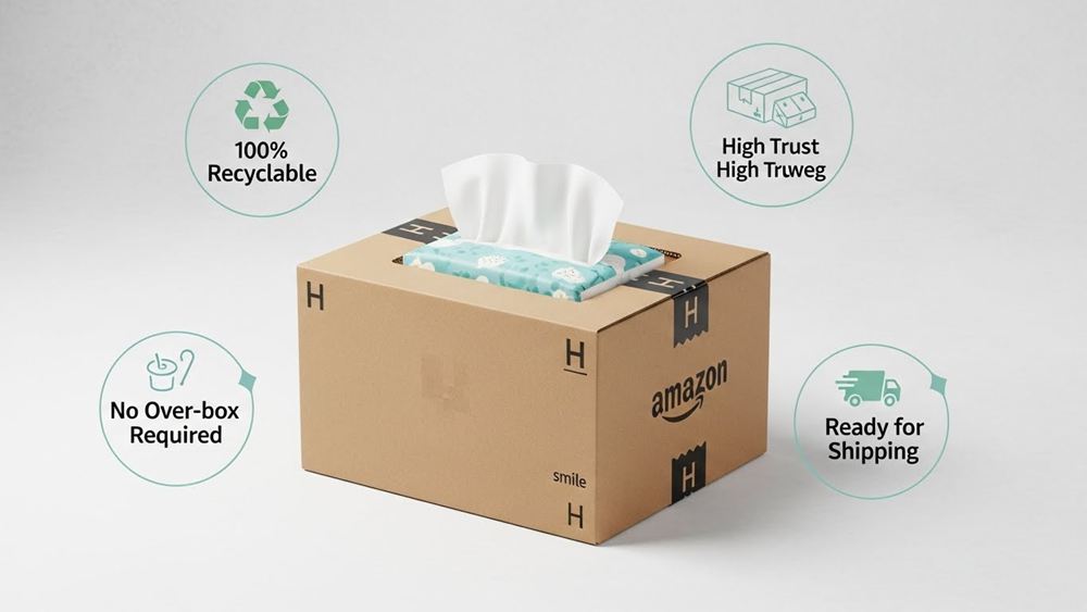 Tissue products require a sealed, transparent polybag with a minimum thickness of 1.5 mil. Any bag opening 5 inches or larger must display a printed suffocation warning. Shipping boxes must be six-sided corrugated cardboard, stay under 25 inches on any side, weigh less than 50 lbs, and pass a 3-foot drop test.