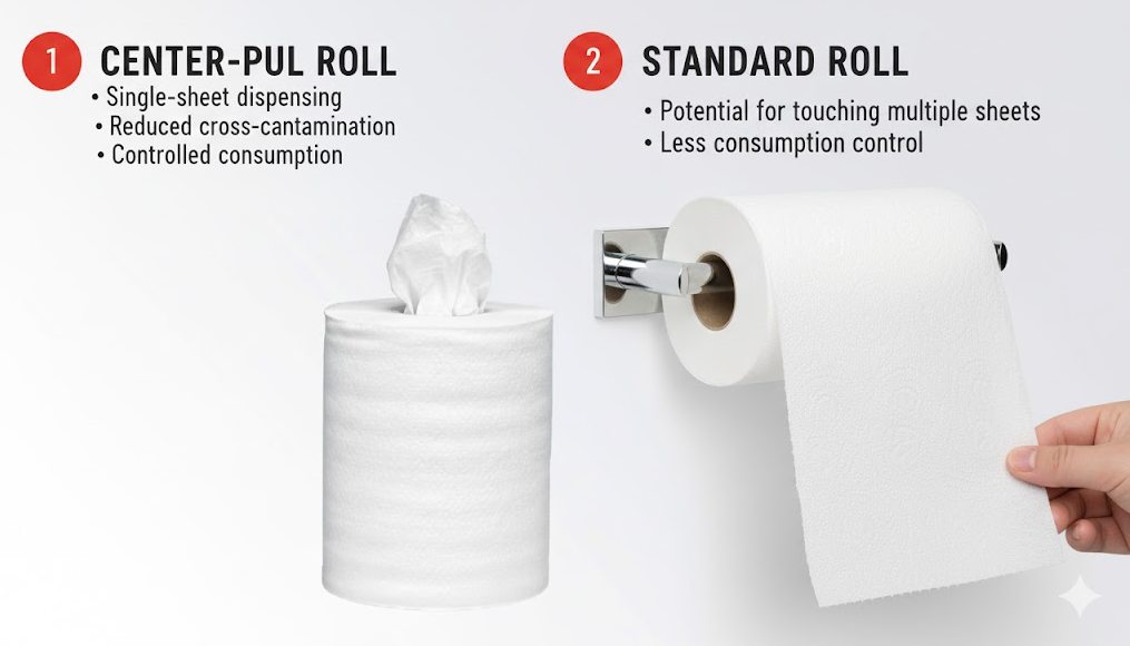 For facilities where hygiene is non‑negotiable—such as medical centers, food preparation areas, or childcare sites—center‑pull systems are the prudent choice. They restrict hand contact to the dispensed sheet, lowering cross‑contamination risk, and their higher sheet count per roll reduces refill frequency in demanding environments.