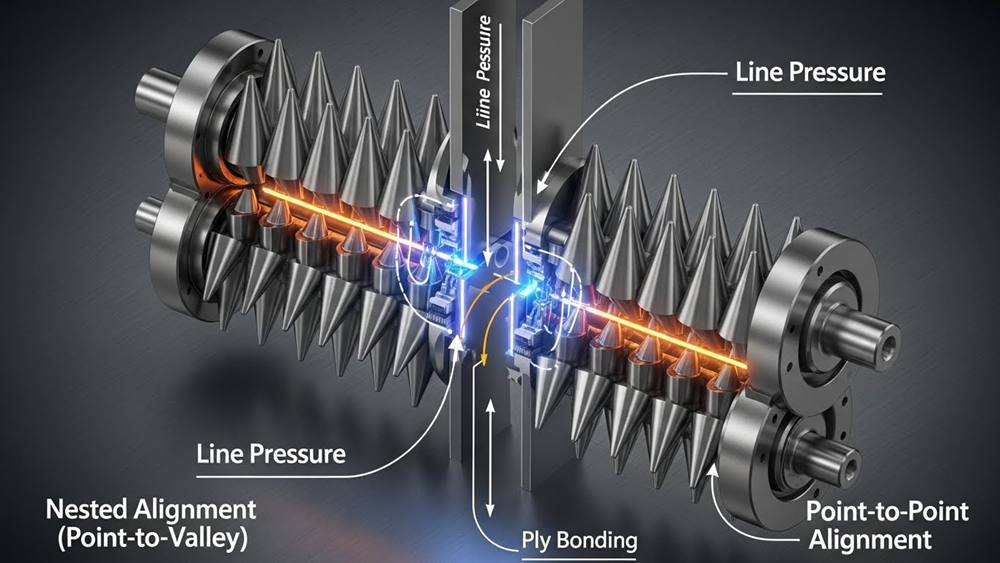 Advanced embossing performance relies on the interplay between engagement depth and peak pressure. Modern nested configurations, such as MarryShoe systems, use shoe-press mechanics to extend the nip zone and reduce fiber damage during high-speed runs.