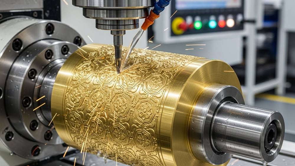 Parametric 3D CAD modeling and grayscale-to-surface conversion translate complex textures into precise geometries for 4th-axis CNC machining and high-speed paper production.