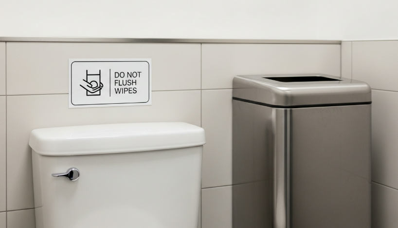 • Provide clear waste type labeling (e.g., ‘Wipes Only’) and, if required, a secondary waste stream for sanitary products.