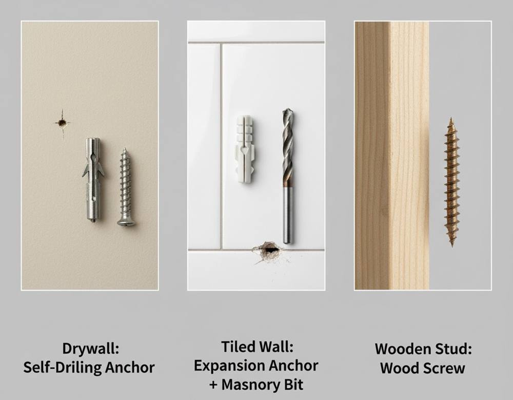 Anchor selection directly determines how well the bracket resists daily wear. For the most common scenario, a toilet paper holder anchor for drywall, use self-drilling metal or toggle anchors for a stronger grip than thin plastic inserts. For tile or plaster, choose masonry anchors and pair them with bits rated for hard surfaces to prevent cracking and ensure a stable hold. If a stud is accessible, skip anchors and drive wood screws straight in for maximum strength. Avoid low-grade plastic options—they often split under pressure and lead to premature failures.