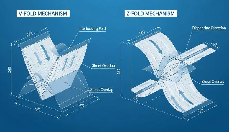 Match sheet dimensions to dispenser apertures: design sheet widths within 102–132 mm. Require rapid disintegration performance that meets North American and European septic standards for any product intended for those markets. For V‑Fold applications use a simpler center/half fold for compact stacks; for Z‑Fold specify tighter fold geometry to maintain the interlocking zigzag that supports reliable pop‑up dispensing.