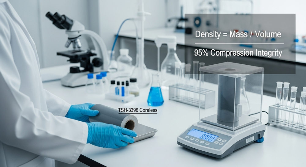 Use the bundle example to apply the formula: TSH-3396 bundles weigh 5,000 g for 28 rolls, so mass per roll = 178.57 g. Measure outer diameter (OD) and core OD with digital calipers to ±0.01 cm, and measure width to ±0.1 mm. Insert those measurements into the cylindrical shell formula and compute density to three significant figures to match lab precision.