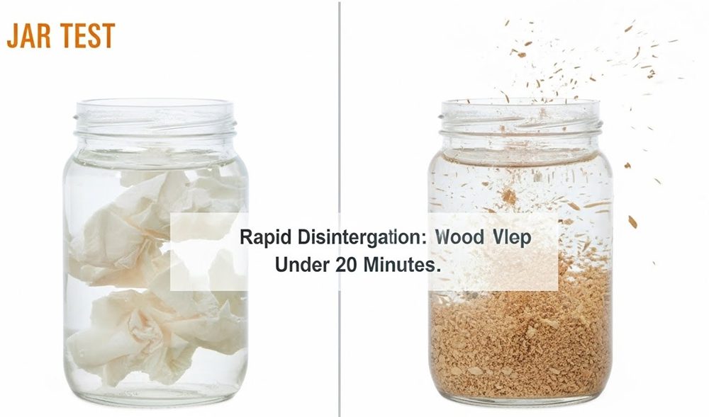 Facility managers use the jar test to simulate how paper reacts to water agitation inside plumbing lines. The process involves placing 4–5 sheets in a clear jar, filling it halfway with room-temperature water, and shaking vigorously for 10 seconds. We then observe the particle size and how quickly the material fragments into a pulp that can navigate aging pipe networks.