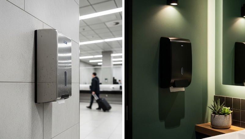 Stainless steel dispensers are more durable, vandal-resistant, and have a longer service life; they are heavier, more expensive, and require secure anchoring. Plastic dispensers are lower cost, lightweight, corrosion-free, quieter, and easier to replace; they suit low- to medium-traffic offices. Choose stainless steel for high-traffic or high-risk public restrooms and plastic for cost-sensitive, low-risk office environments.