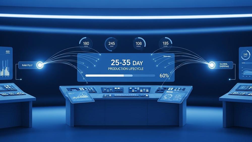 A 25-35 day production lifecycle integrates material sourcing, fabrication, and logistics into a single planning horizon. This window allows for precise scheduling of the 2,860-ton monthly capacity. For 2026, planners use cycle time data to ensure consistent delivery of custom paper products across 56 countries.