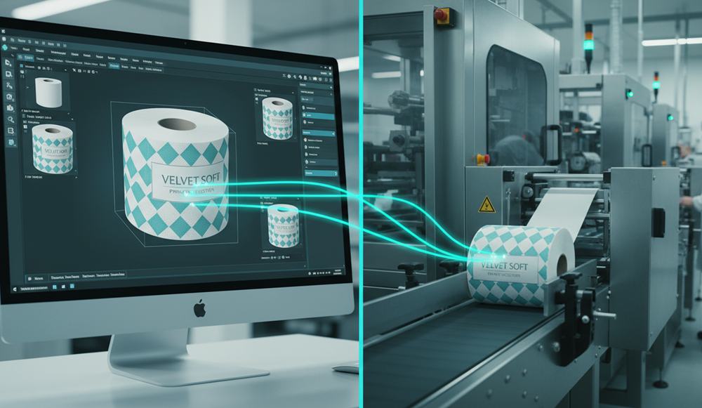 Digital 3D mockups bridge the gap between a design concept and the manufacturing floor. In the private label hygiene sector, flat 2D artwork often hides alignment issues that only become visible once wrapped around a cylindrical roll or a high-density bundle. By generating 3D visualizations, we verify how logos and legal text interact with the physical product geometry before committing to plates or physical samples.