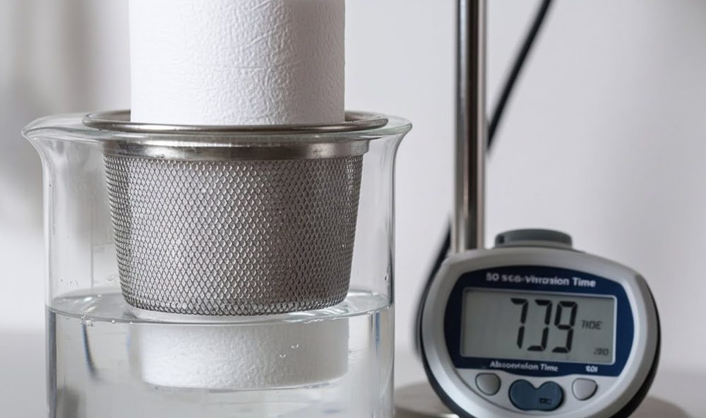 • Automated Immersion: We submerge a cylindrical test basket containing the tissue sample into demineralized water to prevent mineral interference with wicking speed.