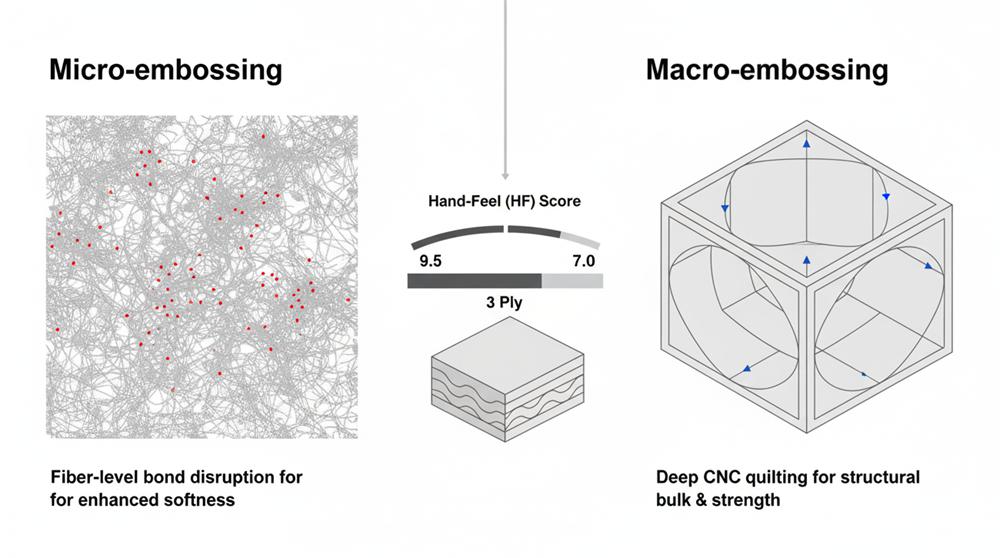 Micro-embossing breaks fiber stiffness for surface softness, while macro-embossing uses deep CNC patterns to lock multiple plies and increase absorbency by 30% without adding fiber cost.