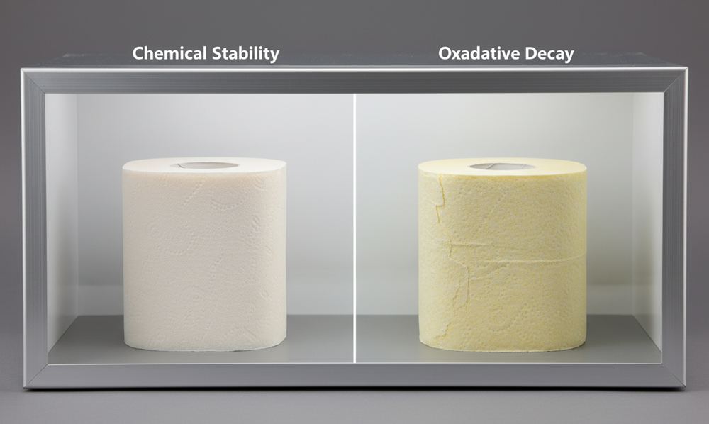 Yellowing is caused by acid hydrolysis and the breakdown of wood pulp fibers. UV light exposure and stressors like high humidity or fluctuating temperatures in bathrooms speed up this chemical degradation. These factors cause whitening compounds to lose effectiveness and the paper to discolor.